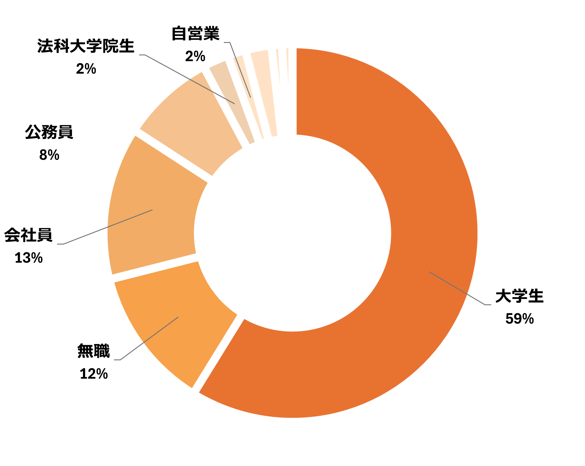 令和7年(2025年)の予備試験合格者を職業別に見ると、「法科大学院生」は全体の2%となっています。