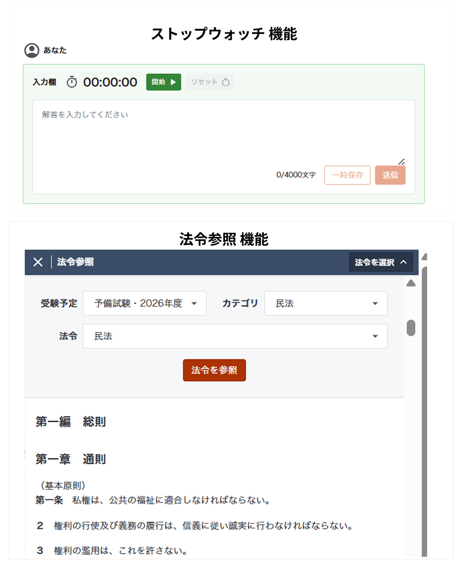 これまでの予備校の答練添削は、合格者による手作業が一般的でした。 ·圧倒的スピード: 書き終えた瞬間に、詳細なフィードバックを生成。記憶が鮮明なうちに復習が完了します。 ·高品質な分析: 膨大なデータを学習したAIが、論理の飛躍や加点ポイントを客観的に指摘。従来型の答練添削を凌駕する精度を追求しました。 |