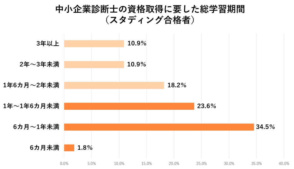 また、中小企業診断士の資格取得のための総学習期間について尋ねたところ、最も多かった回答は「6カ月~1年未満(34.5%)」でした。
