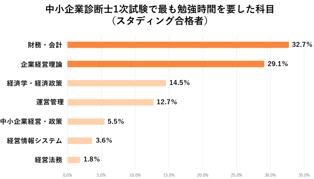 - 1次試験では、財務・会計と企業経営理論に勉強時間がかかる