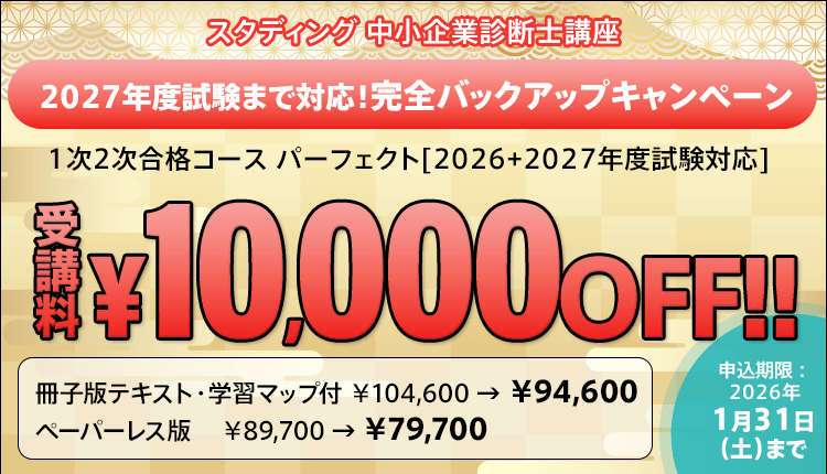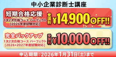 ![]() | 中小企業診断士 2026年1月31日(土)まで 中小企業診断士講座 短期合格応援キャンペーン&完全バックアップキャンペーン学習計画に合わせてお選びいただける「2026年度版」と「2026年+2027年度版」の2種類のコースを期間限定の特別価格でご提供! |