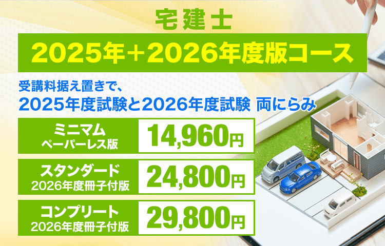 ※宅建士合格コース[2025+2026年度合格目標]冊子付版をご購入された場合には、2026年度版冊子版テキストが付属します。2025年度版は付属しません。