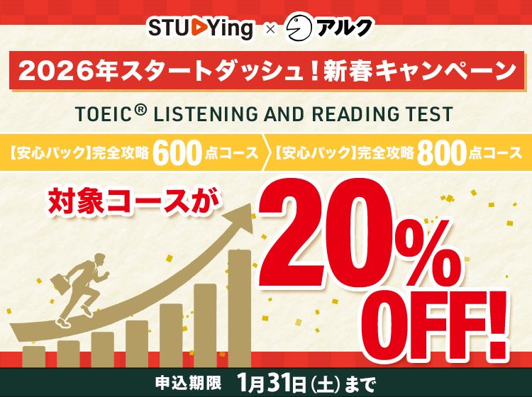 ![]() | TOEIC® TEST 2026/1/31(土)まで TOEIC® TEST 2026年スタートダッシュ!新春キャンペーン【安心パックが20%OFF!2026/1/31(土)まで】この冬からTOEICスコアアップを目指して学習を始める皆様を応援します!スマートフォン一つで学習できるスタディングで、600点・800点クリアを一緒に目指しましょう! |
