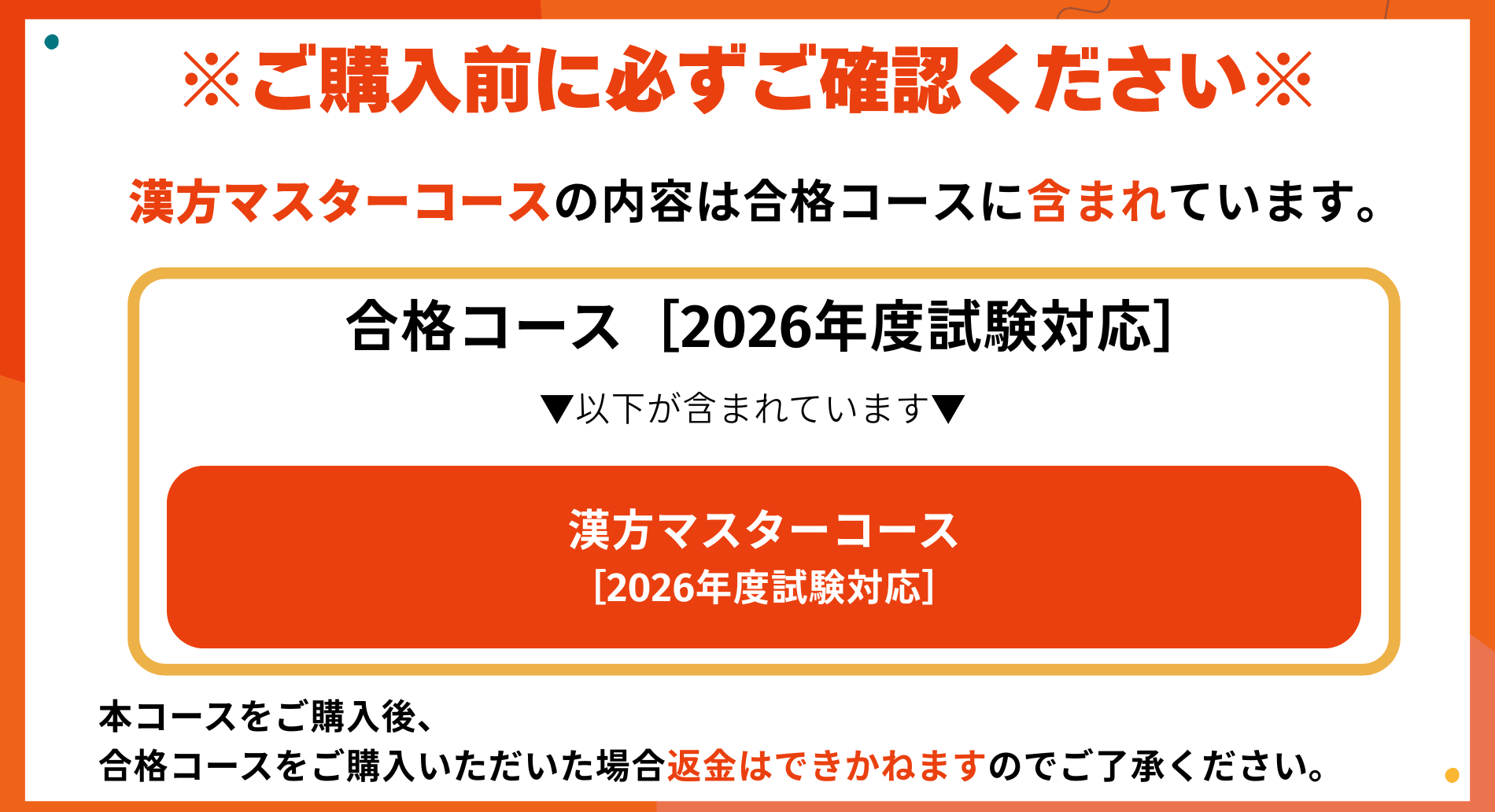 | 登録販売者漢方マスターコースの受講期限は下記となります。 ・[2026年度試験対応]2027年1月31日 全国どの地域で受験する場合も、本コースで学習いただけます。 受講期限を過ぎますと、ビデオ講座、問題集などの教材が使用できなくなりますので、ご注意ください。 |