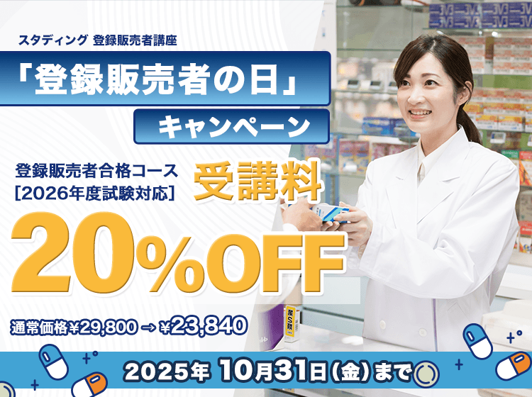 ![]() | 登録販売者 2025年10月31日(金)まで 登録販売者講座 「登録販売者の日」キャンペーン期間限定で2026年度試験対応 合格コースが受講料20%OFF |