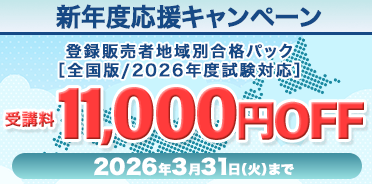 ![]() | 登録販売者 2026年3月31日(火)まで 登録販売者講座 新年度応援キャンペーン期間限定で地域別合格パック[全国版/2026年度試験対応]が受講料11,000円OFF! |