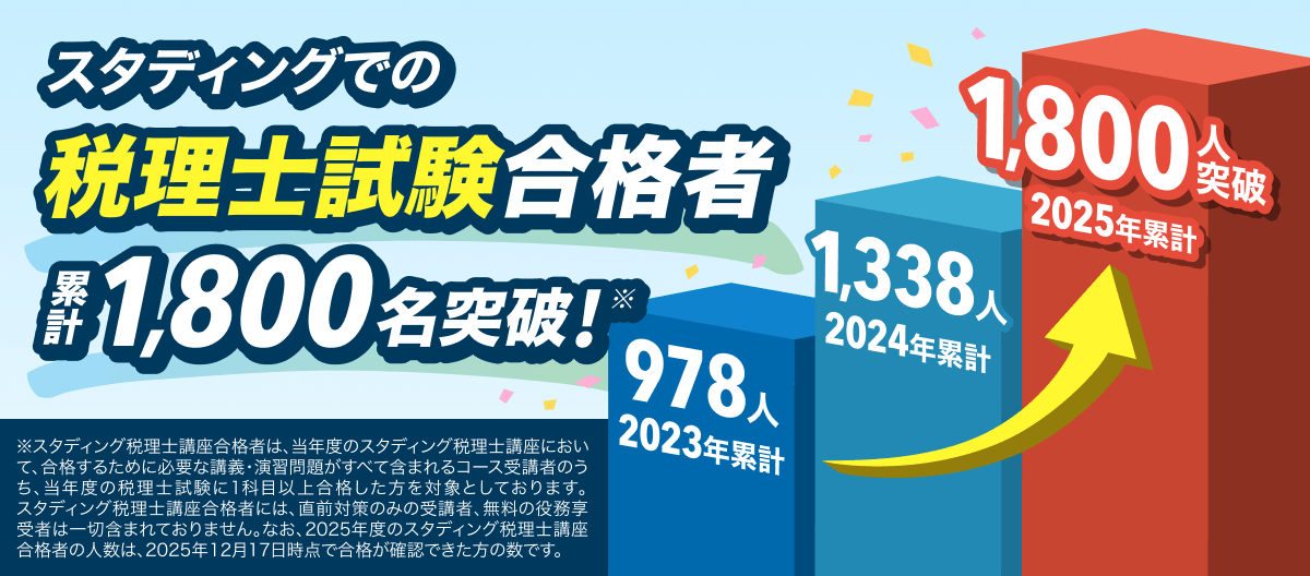 ※1 スタディング税理士講座合格者は、当年度のスタディング税理士講座において、合格するために必要な講義・演習問題がすべて含まれるコース受講者のうち、当年度の税理士試験に1科目以上合格した方を対象としております。スタディング税理士講座合格者には、直前対策のみの受講者、無料の役務享受者は一切含まれておりません。なお、2025年度のスタディング税理士講座合格者の人数は、2025年12月17日時点で合格が確認できた方の数となります。