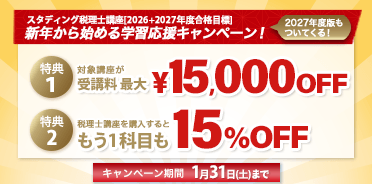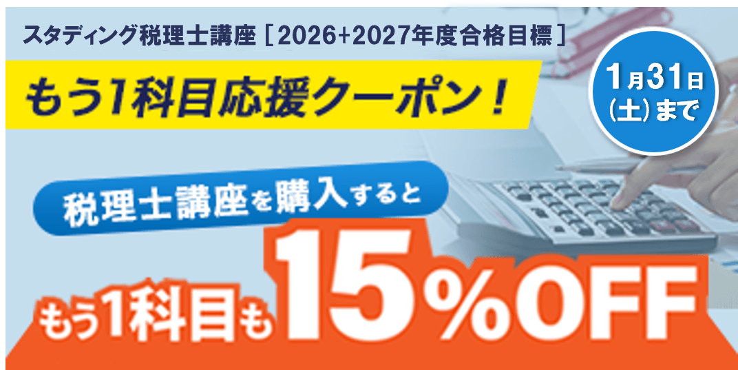 ![]() | 税理士 2026年1月31日(土)まで 税理士 2026年 新年から始める学習応援キャンペーン2026年度・2027年度税理士試験を目指し、1月から学習を始める方を応援する「新年から始める学習応援キャンペーン」です。今なら対象パックが最大15,000円OFFとお得な価格で販売中!さらに、2026年8月からは2027年度版の講座を受講できる次年度更新権付きです! |