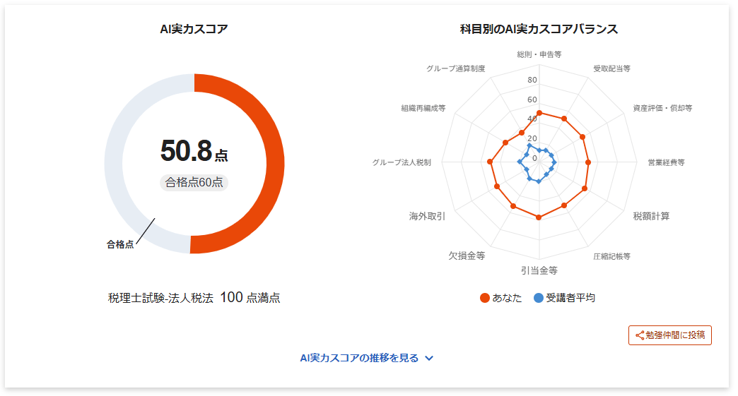 AI実力スコアでは、「今のあなたが税理士試験を受けた場合、どれぐらいの点数を取ることができるのか」をリアルタイムで予測します。
