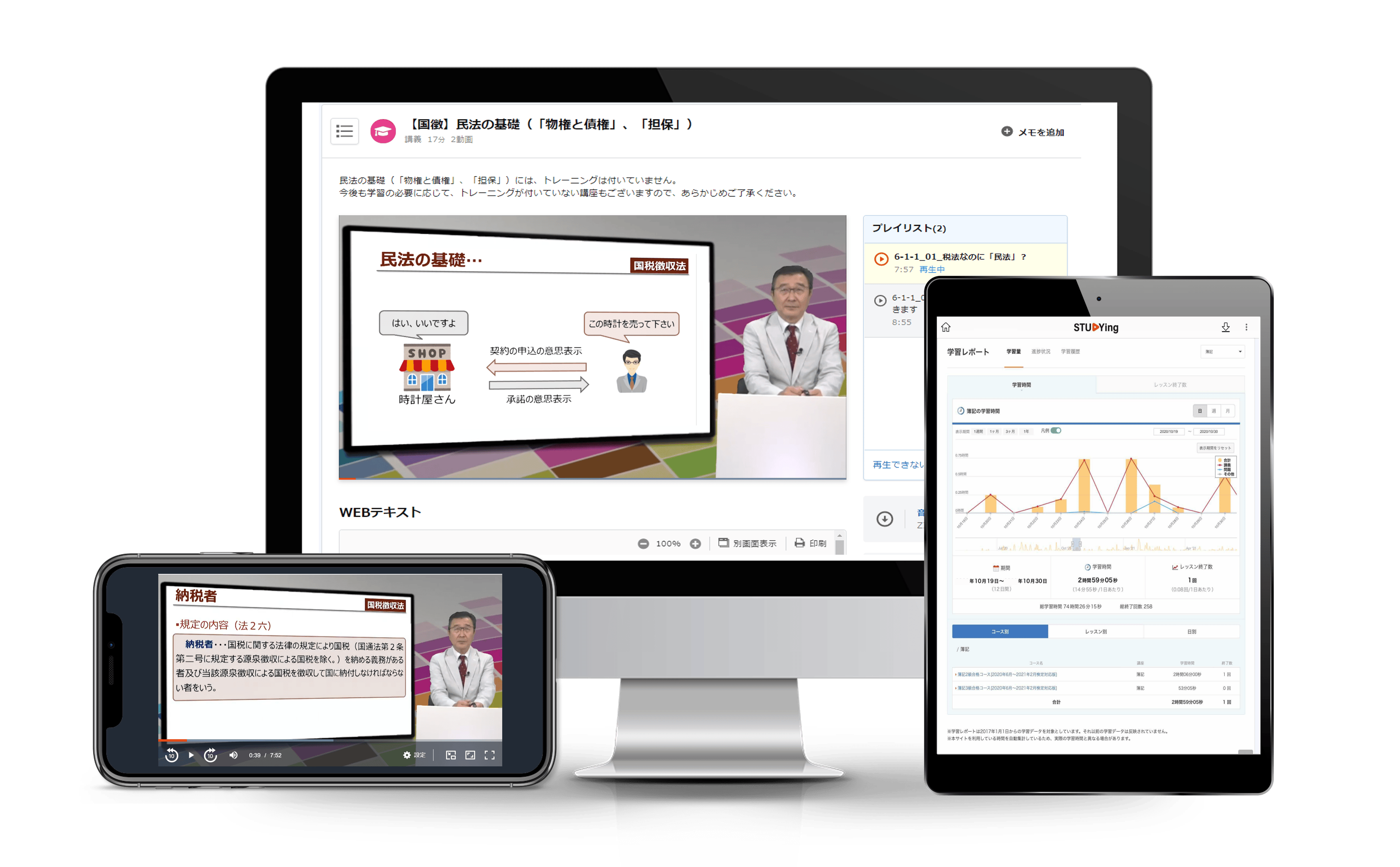 スマート問題集スマート問題集は、基本講座で学んだ内容を確実に覚えるためのオンライン問題集です。通勤時間などのスキマ時間で問題演習を行いながら、重要なポイントを確実に覚えることができます。 スマート問題集では、基本講座の一講座が終わるたびに、基本講座の単元に合わせて出題されます。 問題の内容は、本試験の過去問を分析し、本試験の問題を解く上で必須の知識について重点的に出題しています。また、問題を解いた後に、わかりやすい解説を読むことで効率よく試験に合格するための基礎知識を吸収できるように作られています。 スマート問題集では、問題を解くたびにスタディングマイページに成績が記録されます。科目ごとの進捗や平均点なども一目でわかるようになっています。さらに、間違った問題だけ後でまとめて出題される機能もあるため、効率的に得点アップを行えます。 ![]() |