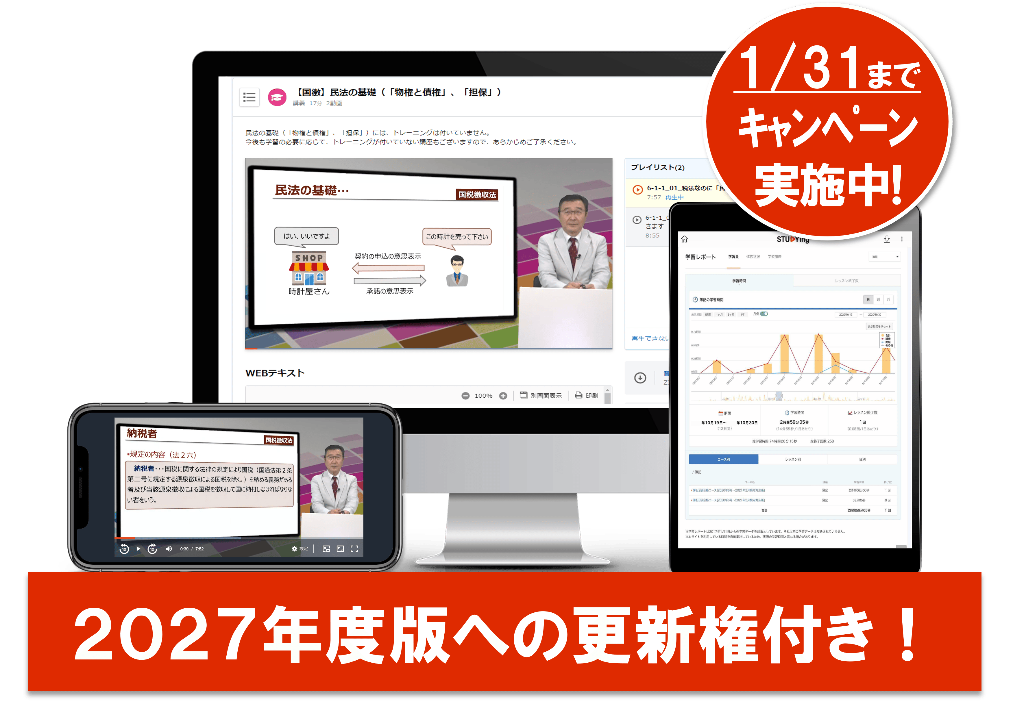 現在リリース済みの2026年度版で先取り学習を始め、今後リリースされる2027年度版を続けて受講することができます。2027年度試験に向けて余裕を持って進めたい方へおすすめです。