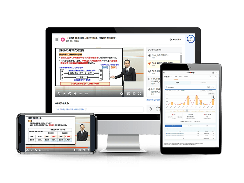 | スタディング 税理士講座の「消費税法」が、2026年度合格目標コースより全面リニューアルいたします! 新たに担当するのは、講師歴14年、数多くの合格者を輩出してきた伊藤忠好先生です。伊藤先生は、これまで大手資格学校で教壇に立ち、受講生が「理解しやすい」「続けやすい」講義を提供することをモットーに、これまで多くの合格者を輩出してきました。 伊藤先生の豊富な経験と、スタディング独自の効率的な学習ツールを組み合わせた新しい講座で、あなたの合格を全力でサポートします! 伊藤忠好先生からのメッセージはこちら |