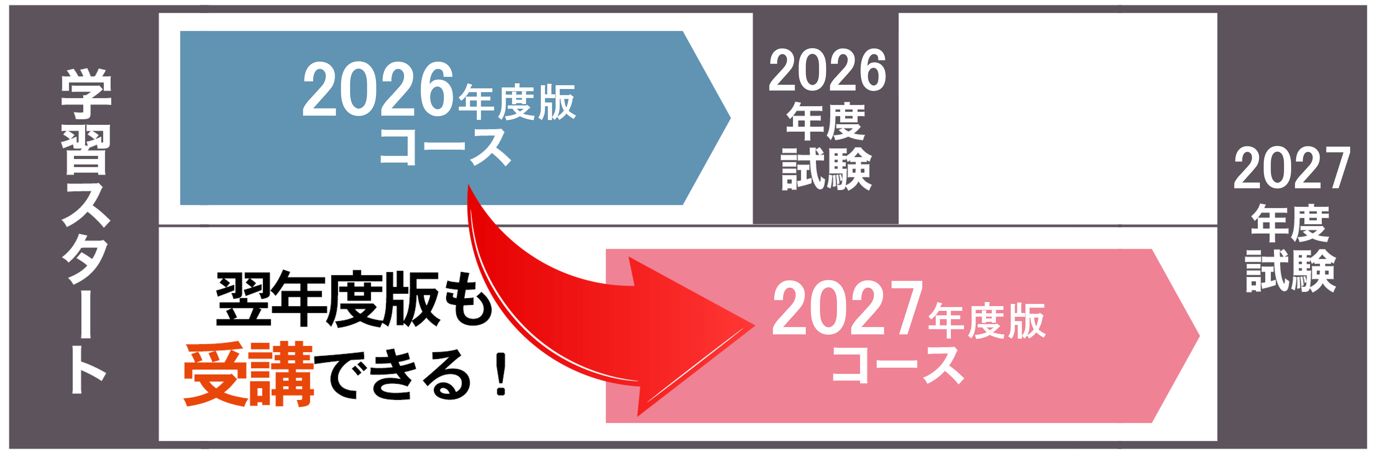 現在リリース済みの2026年度版で先取り学習を始め、今後リリースされる2027年度版を続けて受講することができます。2027年度試験に向けて余裕を持って進めたい方へおすすめです。